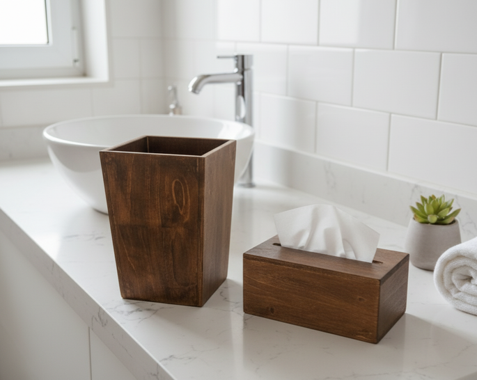 ست سطل زباله و جا دستمال کاغذی چوبی