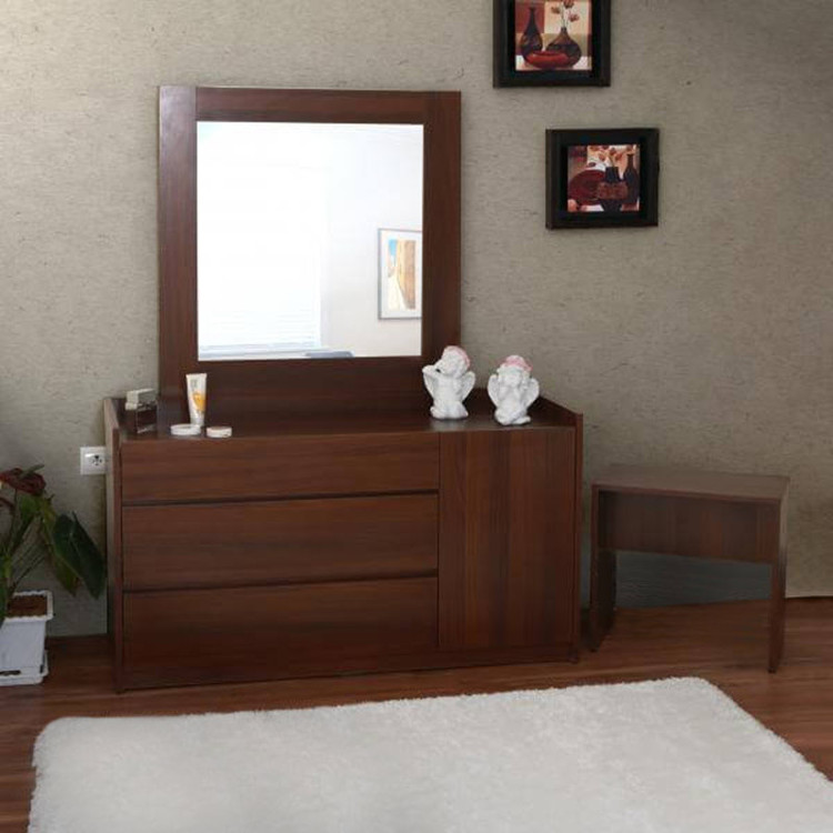 این میزآرایش از ملامینه ضدخش وبسیار باگیفت ساخته شده دارای سه درب وکشوهای جا دار استفاده از ابزار یراق باکیفیت(بدون آیینه)