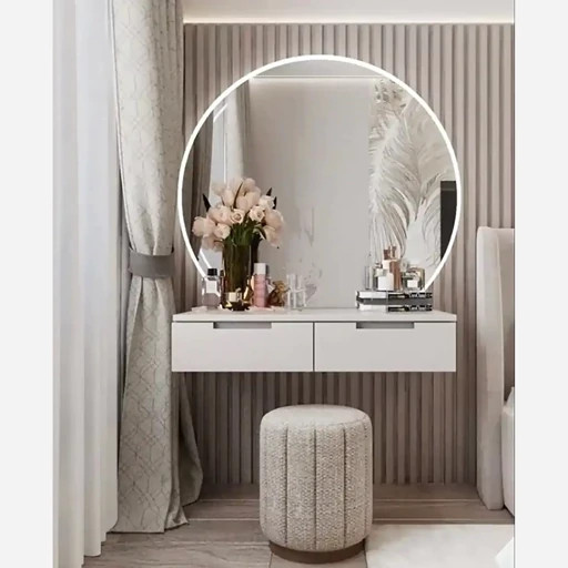 میز آرایش با ظرافت و کیفیت عالی از جنس mdf براق ساخته شده است. ریل به کار برده شده بهترین جنس موجود در بازار میباشد . همچنین شما میتونید به صورت قسطی خرید کنید.